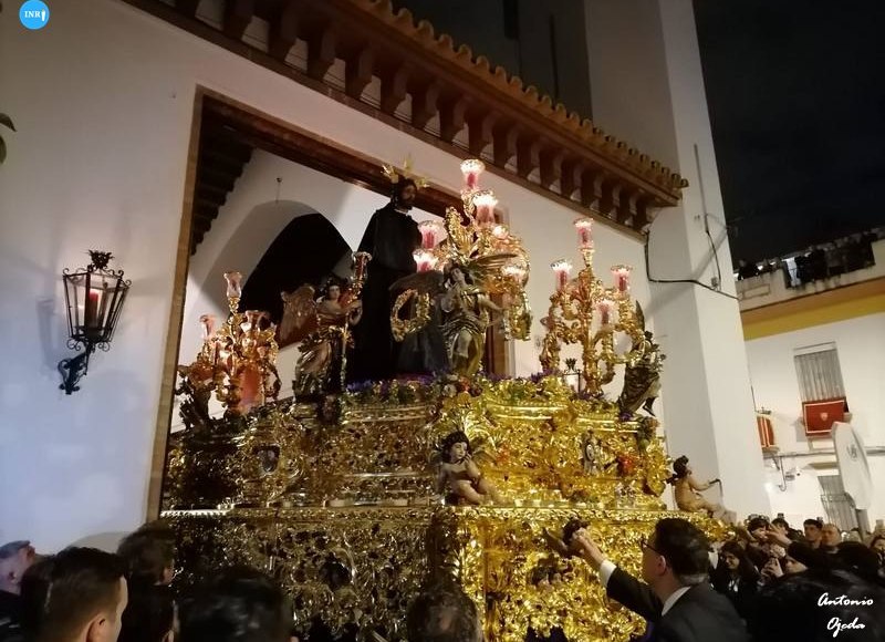 Aún con las primeras luces de la noche entró en su templo el paso de misterio poco antes de las 21.25 horas. Pero ese cielo se tornó a rojo y comenzó a llover de manera abundante. Ese chaparrón comenzó a caer cuando la Virgen del Rocío estaba por el entorno de la Pila del Pato y Cardenal Cervantes, por lo que el paso tuvo que acelerar de manera ostensible, a paso de mudá, hasta su entrada entre un mar de paraguas que esperaban en su plaza, quince minutos después.