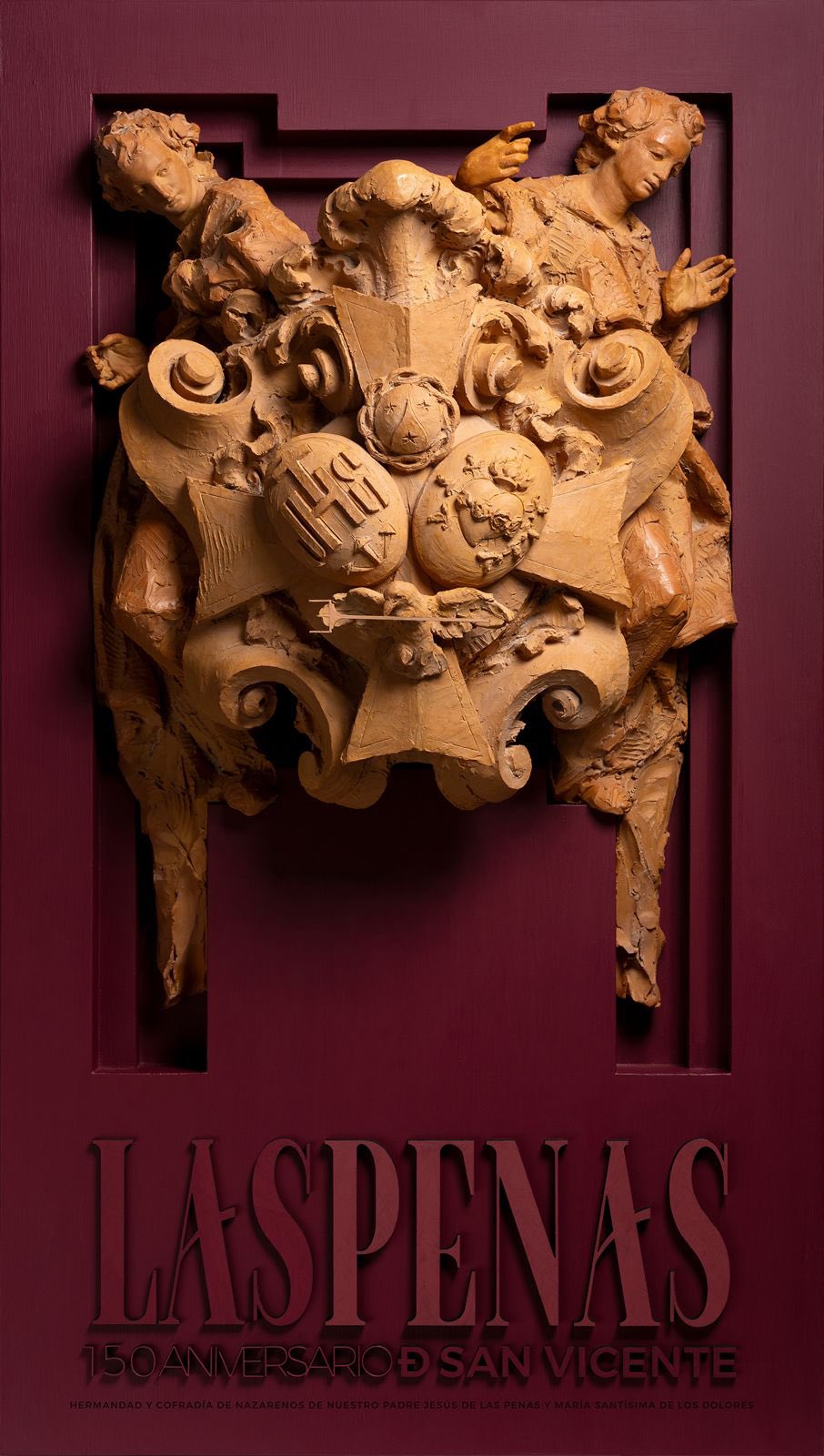 La obra está enmarcada en un rotundo color carmín, se eleva de forma monumental el escudo corporativo de la hermandad y cofradía de las Penas. Una glorificación que alude a la estatuaria monumental decimonónica envuelve el blasón, recogido por dos efigies que parecen percatarse de la presencia del espectador. Realizada en terracota en su color y madera estucada, la obra responde al más puro lenguaje plástico de su autor, quien parece dibujar con el barro la cartelería popular de los años veinte. En la parte inferior se suscribe, en clara monocromía, ‘Las Penas’, en un alarde del carácter escultórico de la obra. Sin más, un conjunto escultórico ideado para cristalizar y conmemorar la efeméride que su anuncio convoca.