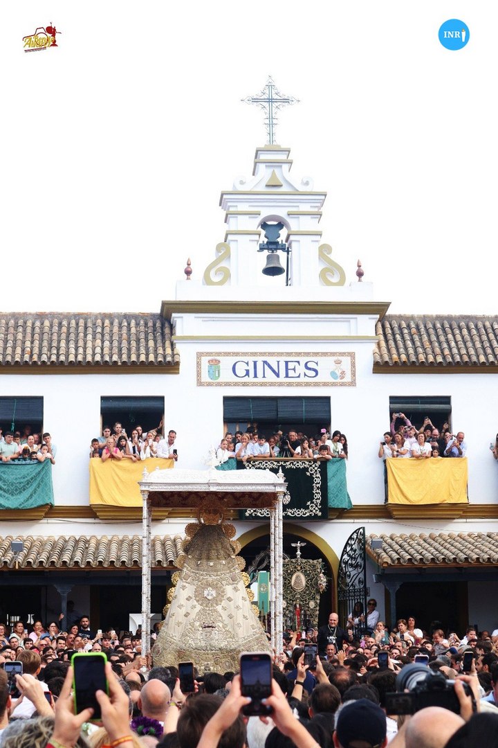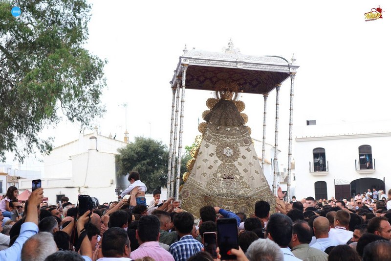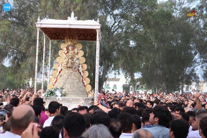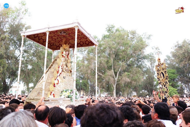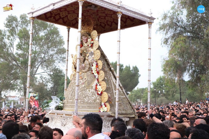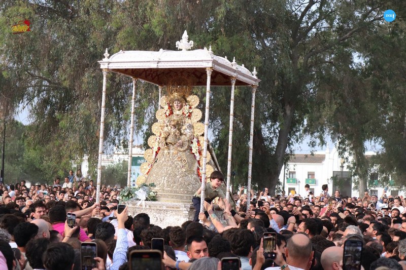 Minutos después salió del santuario, camino al encuentro de las hermandades filiales. Centenares de miles de personas abarrotaron la aldea para buscar a la ‘Blanca Paloma’, que lucía el traje ‘de los Apóstoles’.