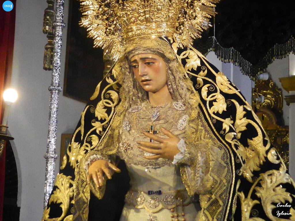 Se pudo ver a la dolorosa con su antiguo manto de salida bordado en oro en terciopelo azul, perteneciente actualmente a la Virgen del Desconsuelo de Jerez, una de las grandes joyas del bordados que salió de la capital hispalense. Estuvo sobre su magistral palio, dejando una estampa de tiempos pretéritos.