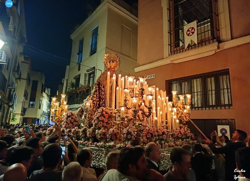 Se pudo ver a la dolorosa con su antiguo manto de salida bordado en oro en terciopelo azul, perteneciente actualmente a la Virgen del Desconsuelo de Jerez, una de las grandes joyas del bordados que salió de la capital hispalense. Estuvo sobre su magistral palio, dejando una estampa de tiempos pretéritos.