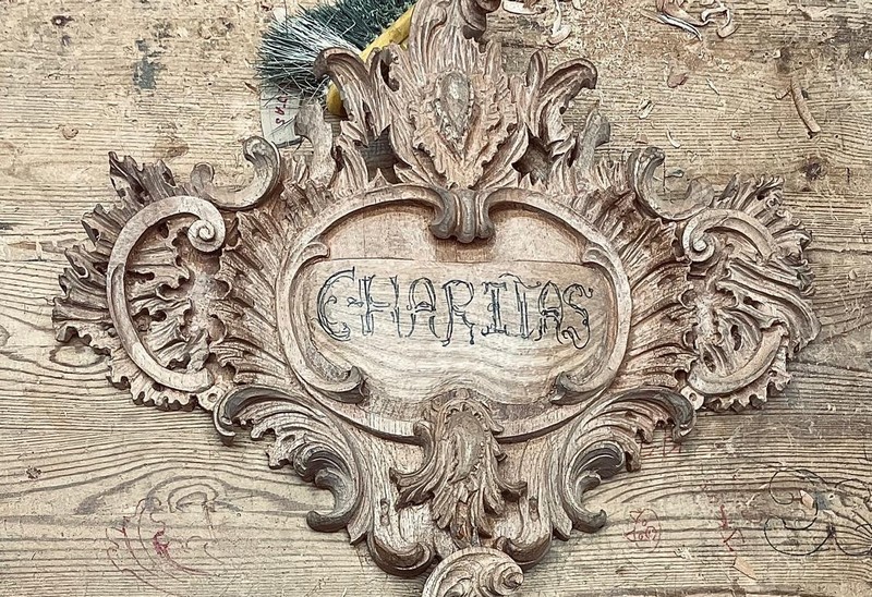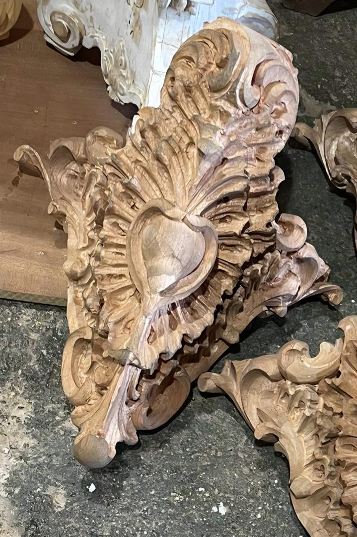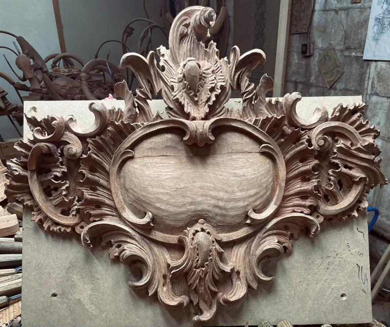 Se trata de una talla ornamental en madera de cedro, que combina la riqueza y la complejidad del estilo rocalla. La talla presenta una ornamentación exuberante y dinámica, con roleos y volutas estilizados que se entrelazan y se superponen. Igualmente, se realizará, una peana a juego-