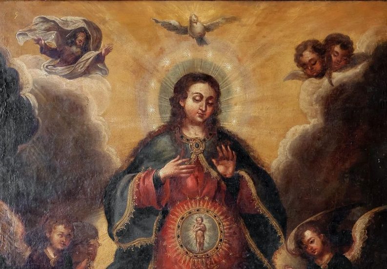 María se erige en el centro de la composición, vestida con túnica jacinto y manto azul, rodeada de un resplandor solar y coronada por un halo de luces y estrellas. Sus pies descansan sobre la luna, aplastando al dragón, símbolo del pecado. A ambos lados, dos ángeles incensantes enmarcan la escena. En la parte superior aparecen Dios Padre, la Paloma del Espíritu Santo y cabezas de querubes. El Niño Jesús, visible en el seno de su Madre, completa la representación trinitaria, otorgando a la obra una hondura teológica excepcional.
