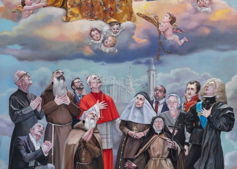 En otro orden aparecen también el Cardenal Marcelo Spínola y Maestre (1835-1906), impulsor del último movimiento diocesano a favor de la Declaración Dogmática, Vicemayoral de la Hermandad y que prestó especial impulso al Voto Asuncionista de 1903, y como no podría ser de otra manera, Fray Isidoro de Sevilla (1662-1750), creador de la devoción a la Divina Pastora, primer apóstol y fundador de su Primitiva Hermandad. Mirando hacia arriba, Santa Ángela de la Cruz (1846-1932), fundadora de la Compañía de Hermanas de la Cruz en su 150 aniversario, quien proclamó a la Divina Pastora como patrona del Noviciado, y arrodillada, en arrobo místico, Santa María Francisca de las Cinco Llagas (1715-1791), terciaria nacida en Nápoles, que extendió allí la devoción a la Divina Pastora, que vería convertirse en Rey de España a Carlos III, rey de las Dos Sicilias, por la milagrosa intercesión de la Divina Pastora.