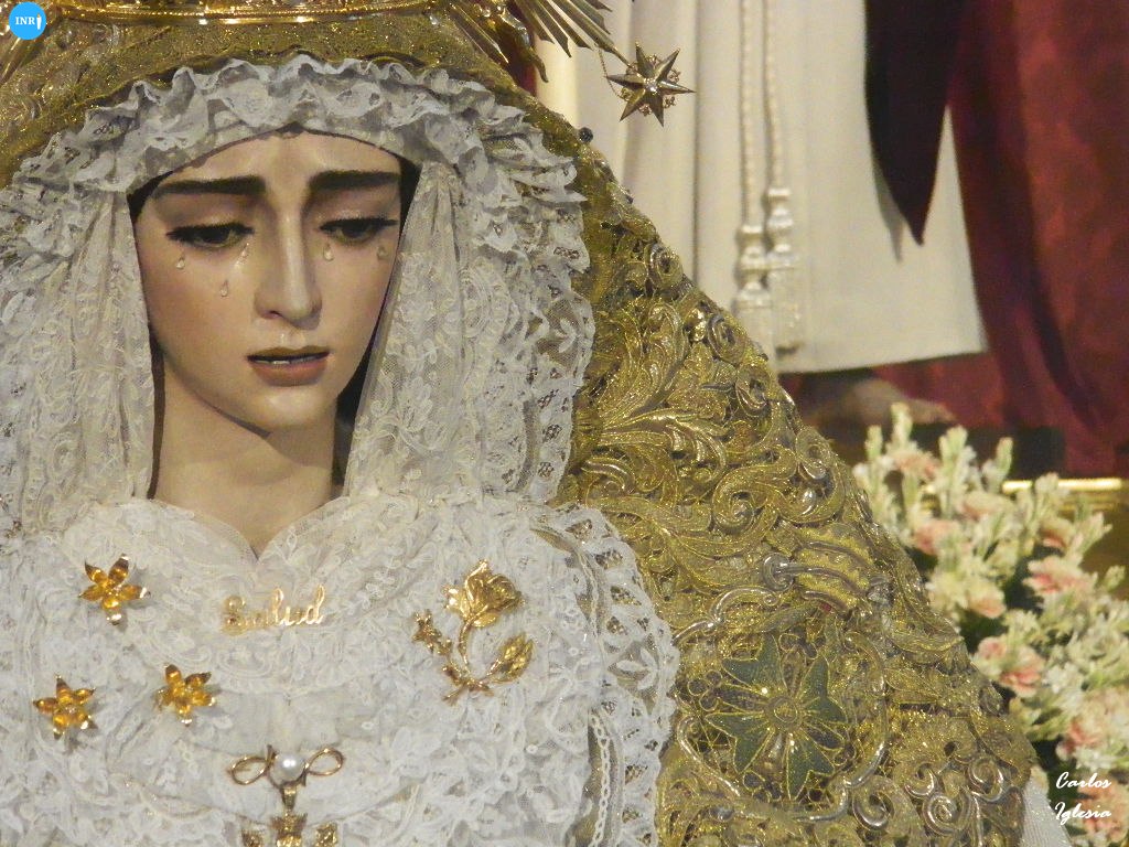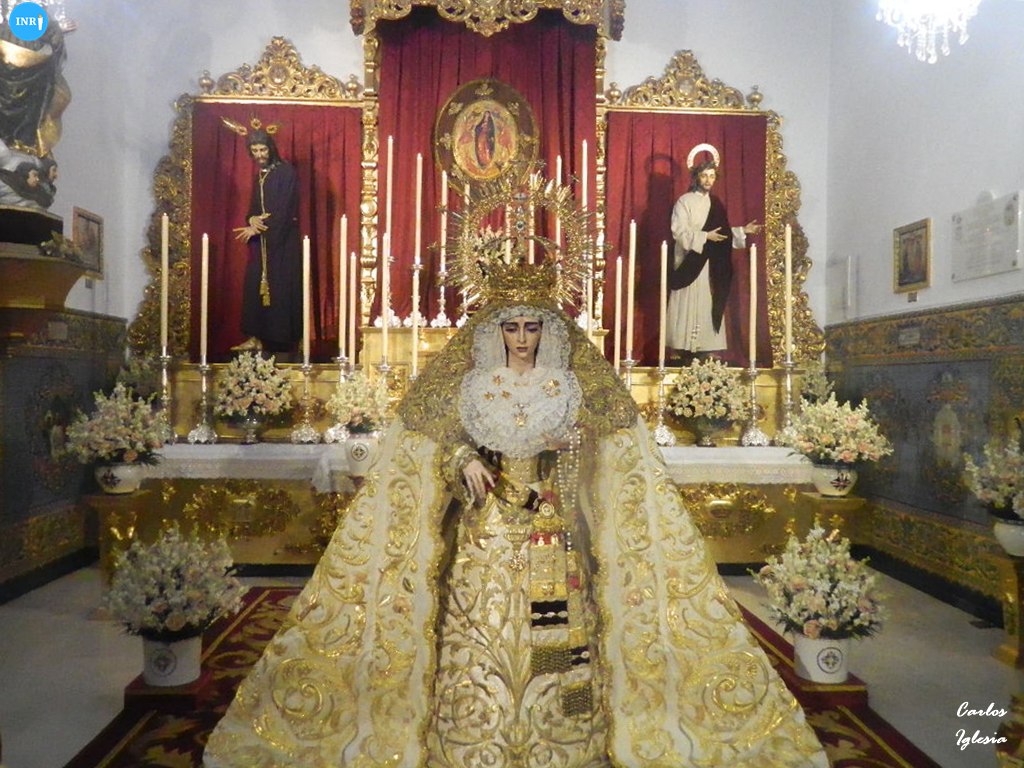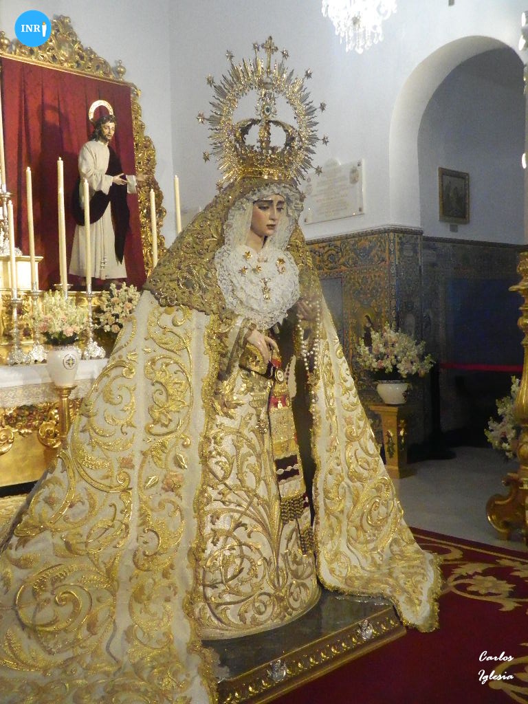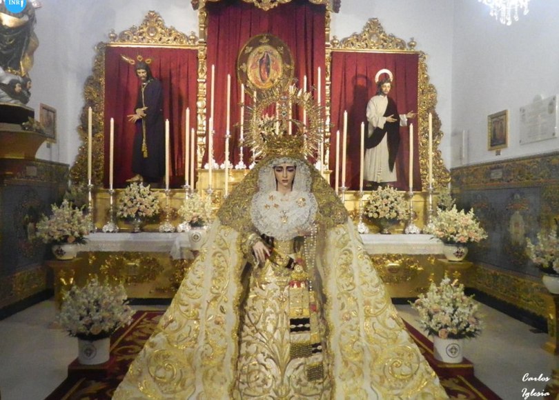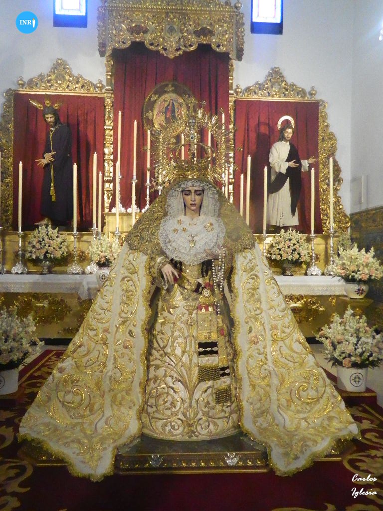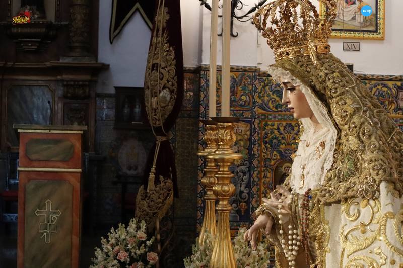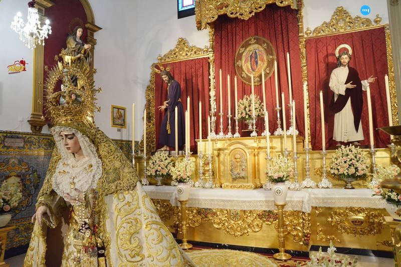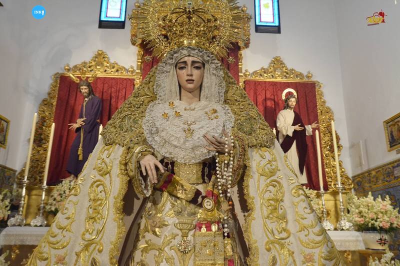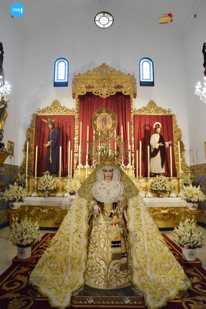 La imagen fue dispuesta a los pies de su altar para la ocasión. Sobre su peana, la dolorosa va vestida con su manto de salida bordado en oro sobre tisú y saya a juego. Tras la imagen, su altar presidido por el Señor del Soberano Poder ante Caifás y San Juan Evangelista.