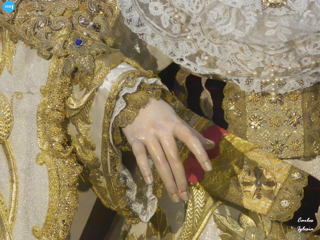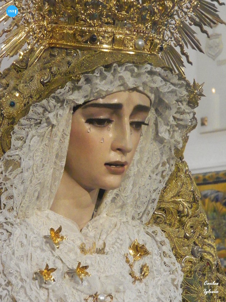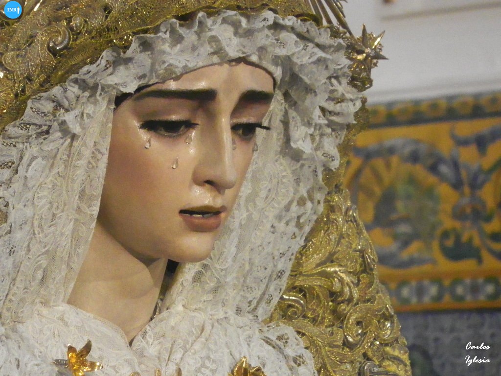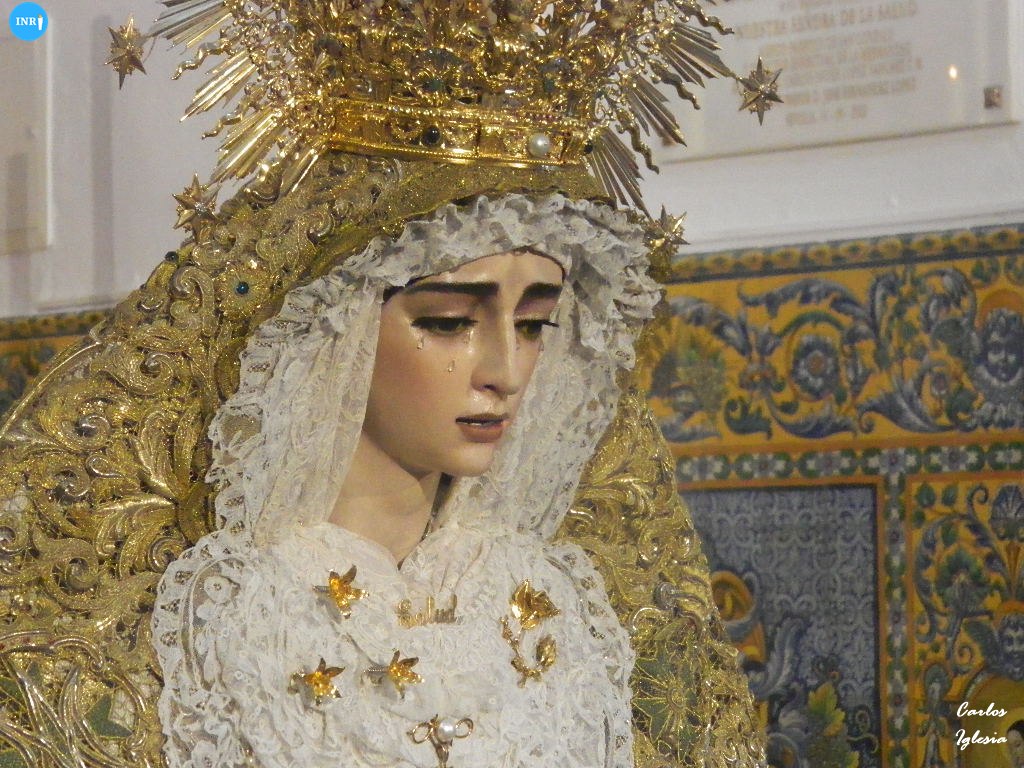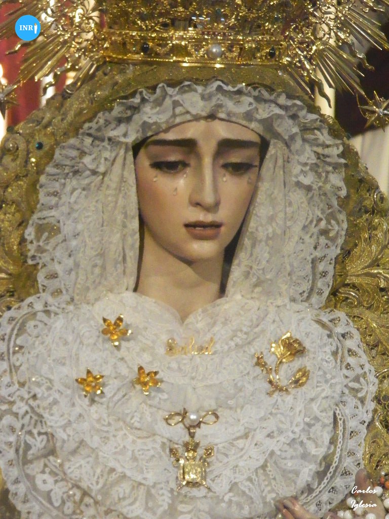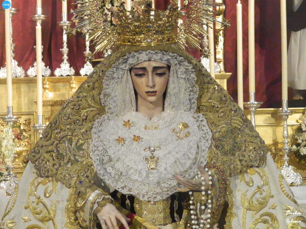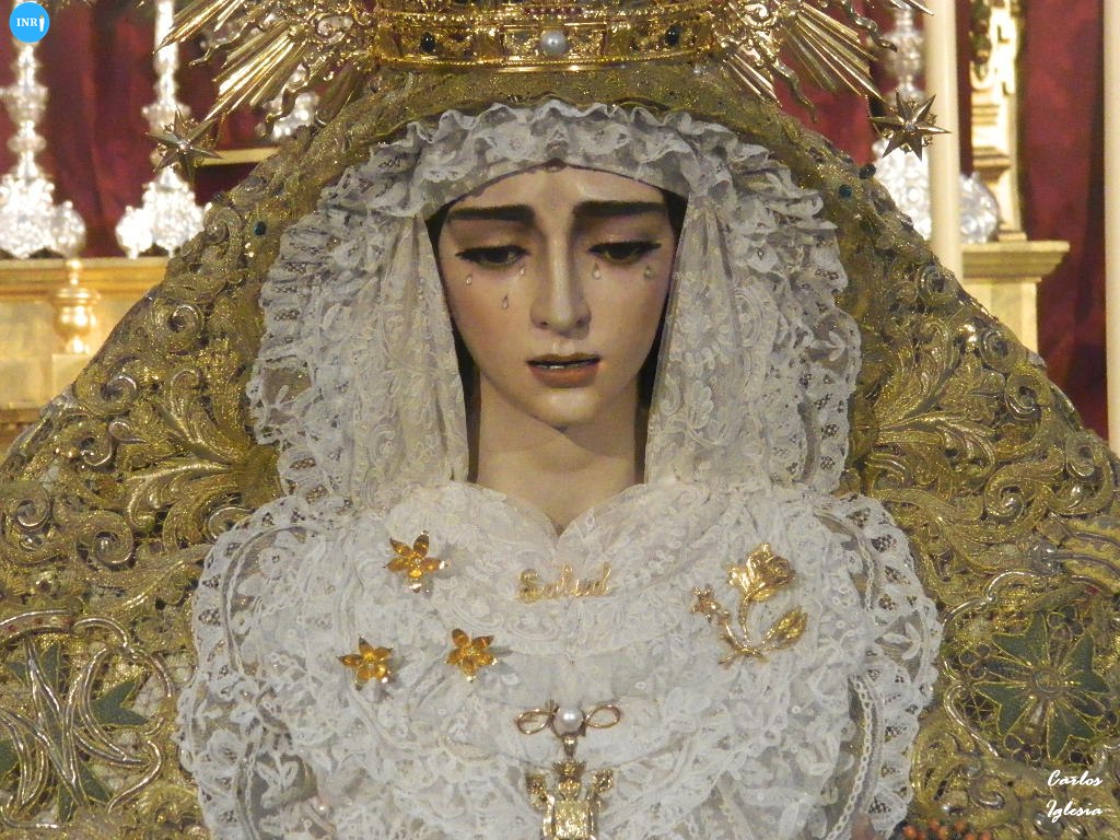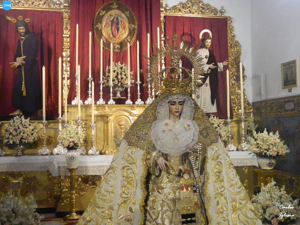 La imagen fue dispuesta a los pies de su altar para la ocasión. Sobre su peana, la dolorosa va vestida con su manto de salida bordado en oro sobre tisú y saya a juego. Tras la imagen, su altar presidido por el Señor del Soberano Poder ante Caifás y San Juan Evangelista.