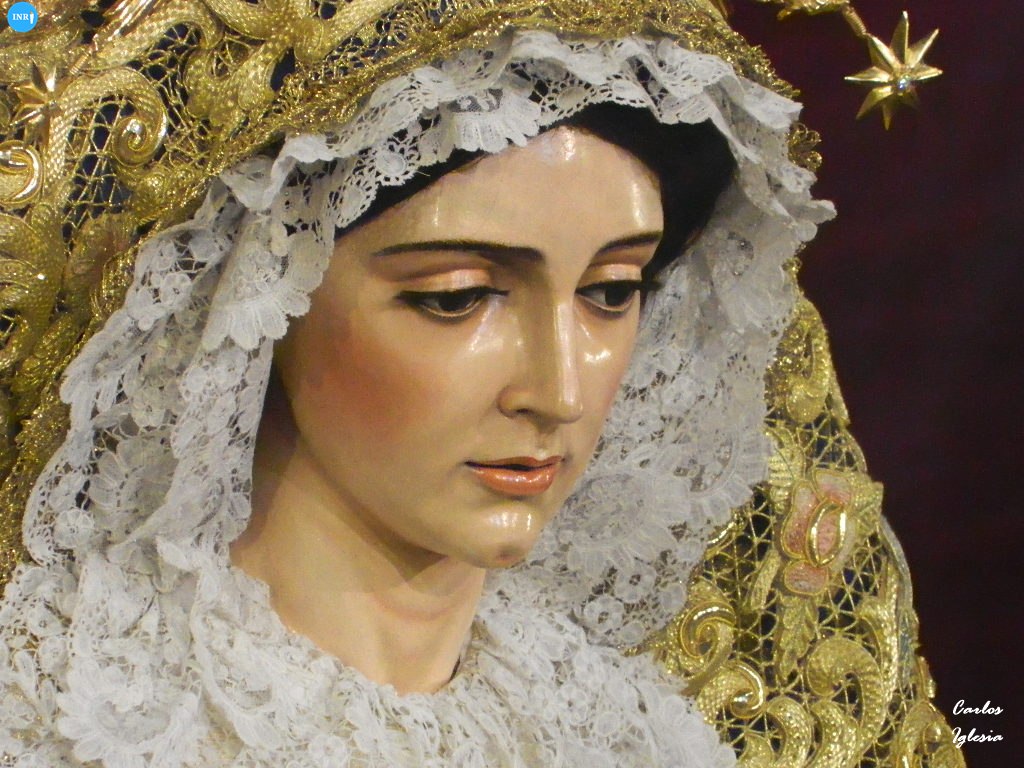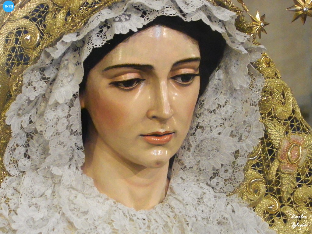 En relación al tratamiento de la policromía, se ha realizado una limpieza superficial y se han fijado y protegido las zonas con riesgos de desprendimiento. También se ha trabajado sobre las alteraciones que presentaba la imagen por el uso de los alfileres a la hora de vestirla mediante una reintegración cromática del estucado y de la policromía, al igual que en zonas donde existían algunas lagunas como en el labio inferior de la imagen. Igualmente es destacable la recolocación de la pestaña del ojo izquierdo de la imagen.