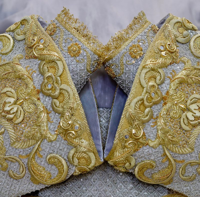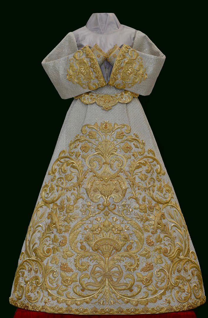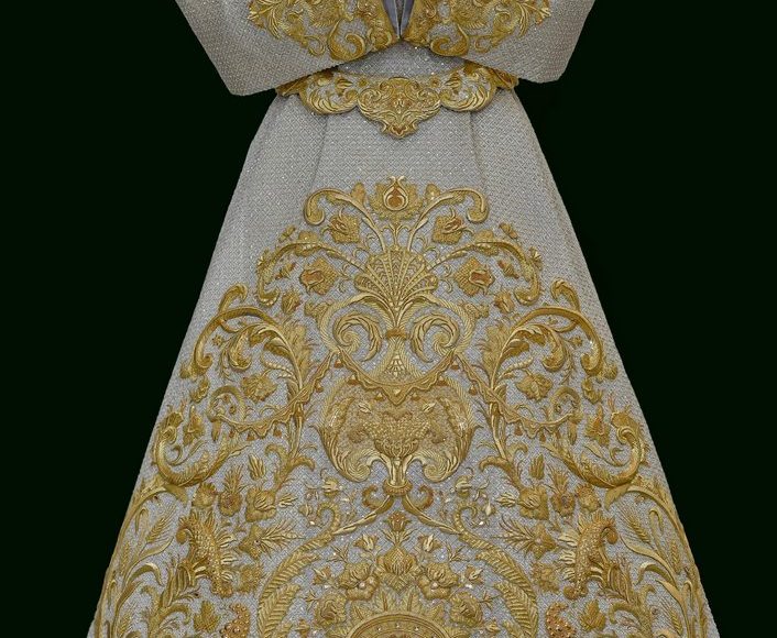 La decoración bordada ha sido realizada en hilo de oro fino, reproduciéndose las técnicas del bordado propias de la época tomada como inspiración, con destacado predominio del bordado directo y la profusión de lentejuelas, canutillos, huevecillos, espiguillas y espejuelos.