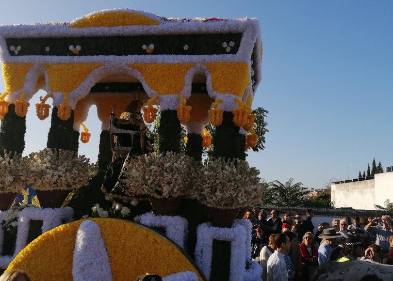 Cabe destacar que el color de la carreta de la imagen varía cada año. Realizadas con flores de papel rizado, se va alternando el amarillo, rosa, celeste y naranja con el blanco. Las columnas se adornan con verde tuya y cestos con unas mil varas de nardos. Va tirada por una yunta de bueyes enjaezados con frontiles de plata y collarines bordados.