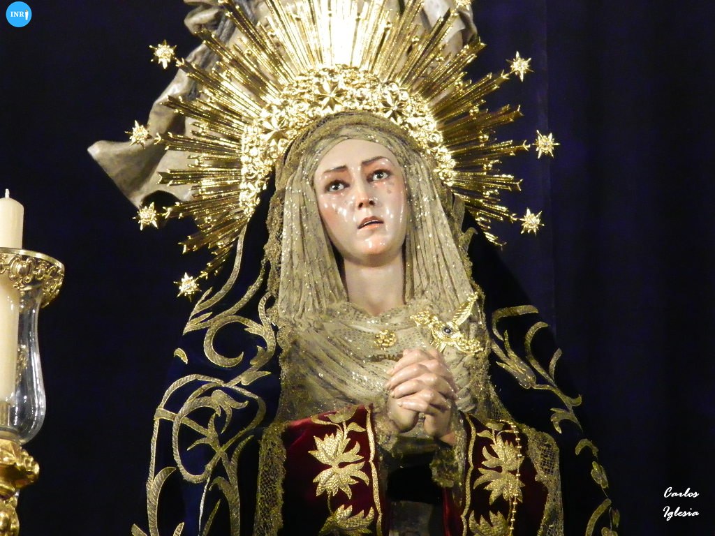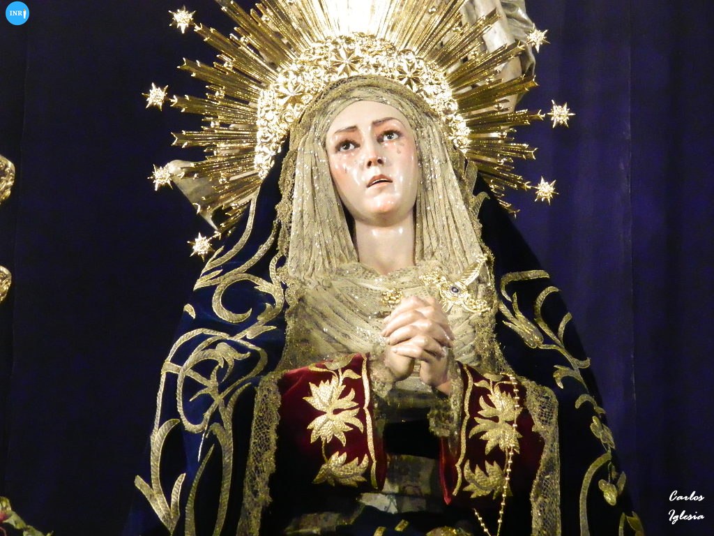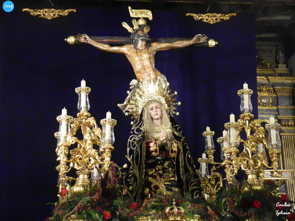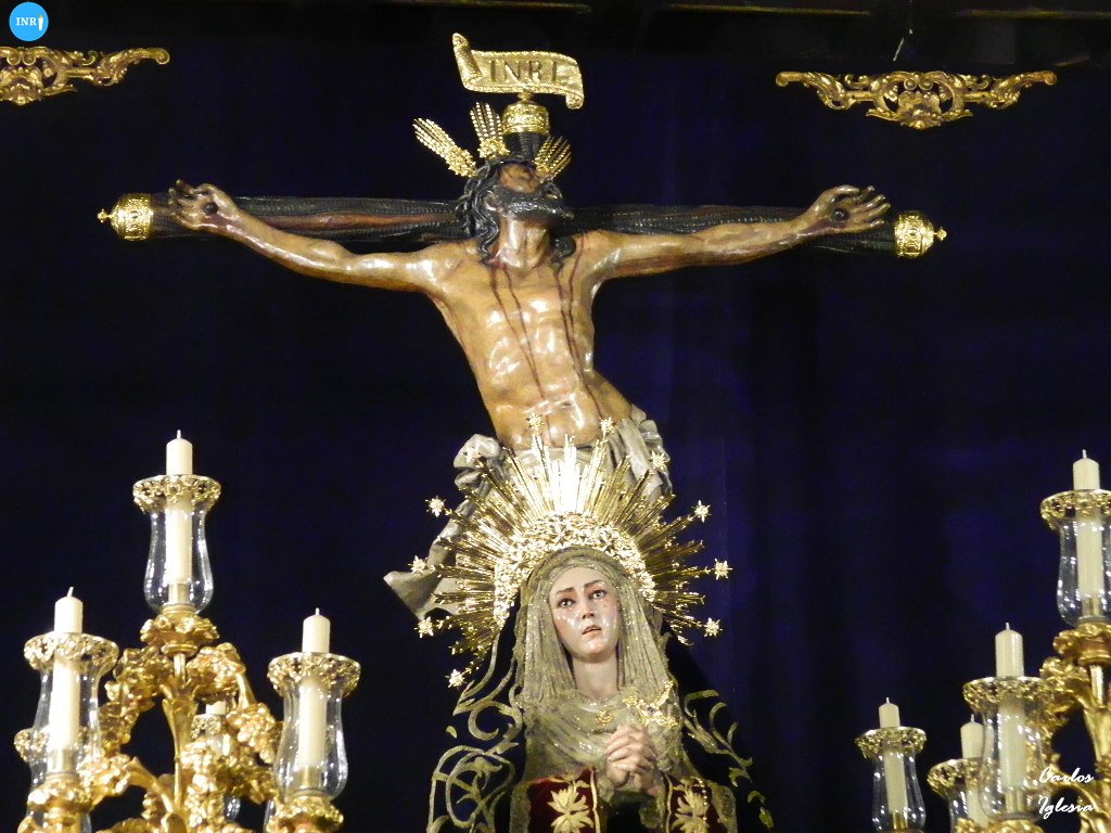 Así se pueden ver al Cristo de la Expiración y a sus pies a la Virgen de las Aguas con las manos entrelazadas, al igual que lo hiciera hasta el año 1922. Porta para la ocasión, cuatro candelabros de guardabrisas cedidos para la Hermandad de la Cena de Jerez de la Frontera.