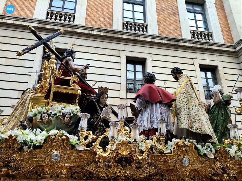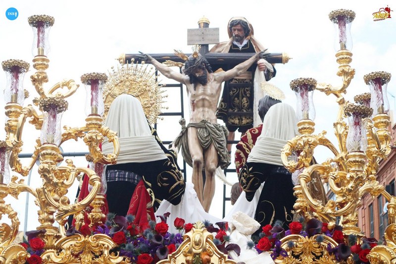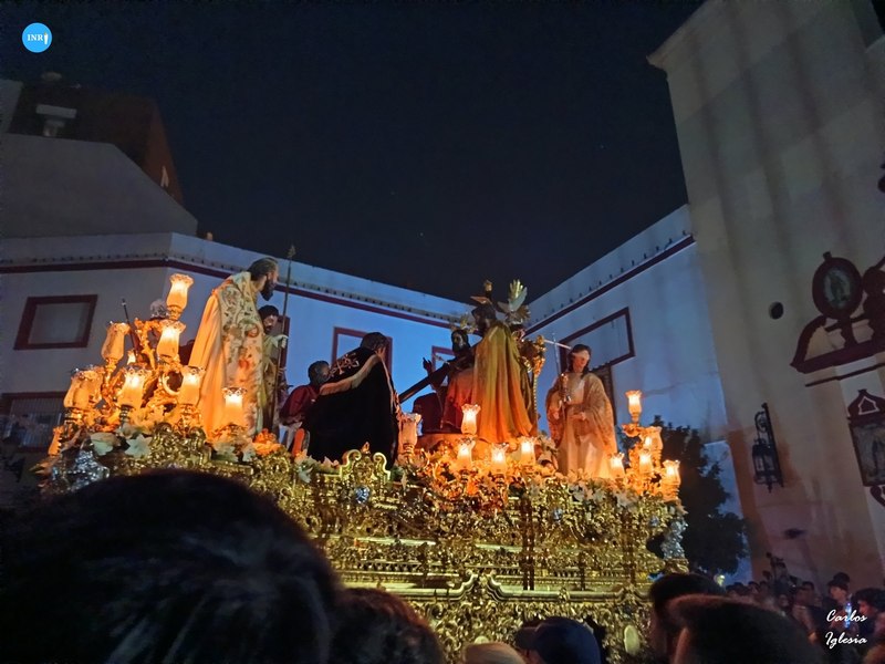 Tres pasos integrados en un cortejo vistiendo el hábito nazareno con el escudo trinitario y tres fueron las formaciones musicales que acompañaron al andar del paso. La Banda de Cornetas y Tambores Nuestra Señora de la Victoria de las Cigarreras al primero, la Banda de Cornetas y Tambores Santísimo Cristo de las Tres Caídas en el segundo y la Sociedad Filarmónica Nuestra Señora de la Oliva de Salteras a la dolorosa bajo palio.