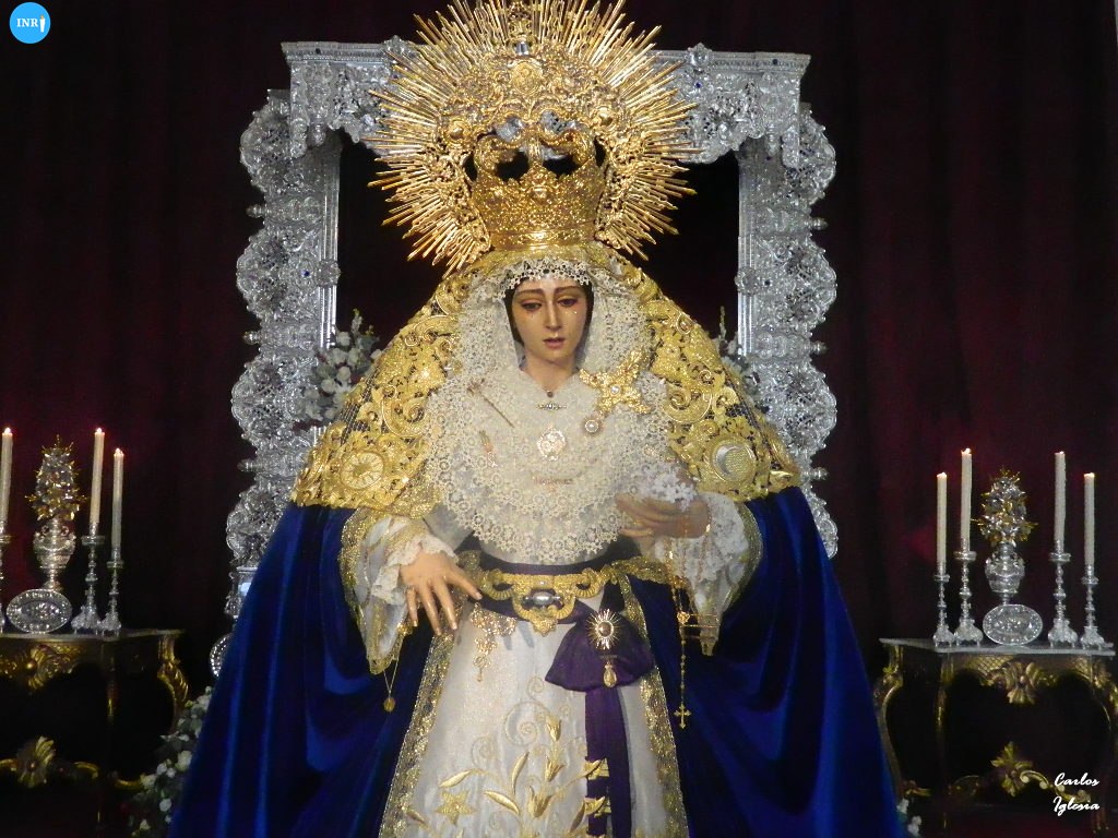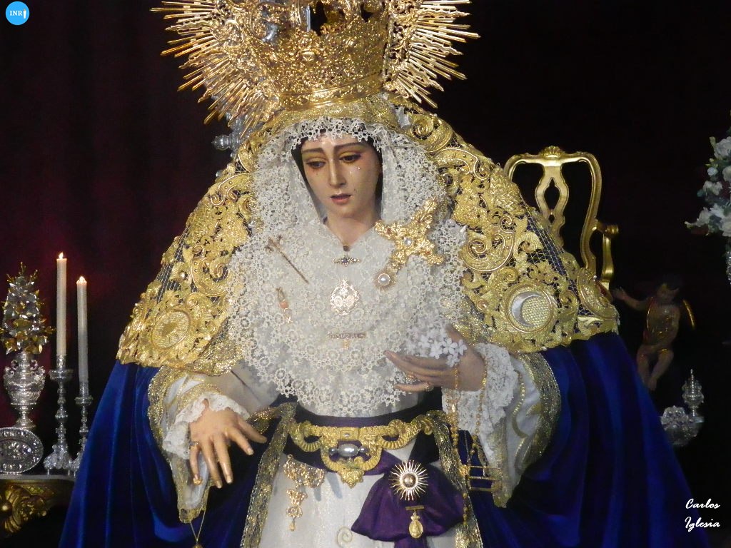 En este culto, la corporación dispuso a la imagen con su manto azul y saya de tisú, además de una corona y toca de sobremanto. Varios candeleros y dosel con el sillón de la Realeza. conforman el altar para la ocasión.