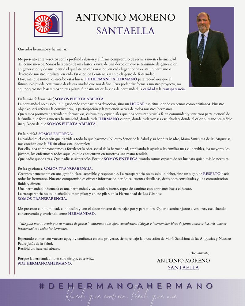 Se presenta “con la profunda ilusión y el firme compromiso de servir a nuestra hermandad tal como merece”. Destaca que la hermandad posee una “herencia de una historia viva, de una devoción que se transmite de generación en generación y de una identidad que late en cada oración, en cada lugar donde exista un hermano o devoto de nuestros titulares, en cada Estación de Penitencia y en cada gesto de fraternidad”.
