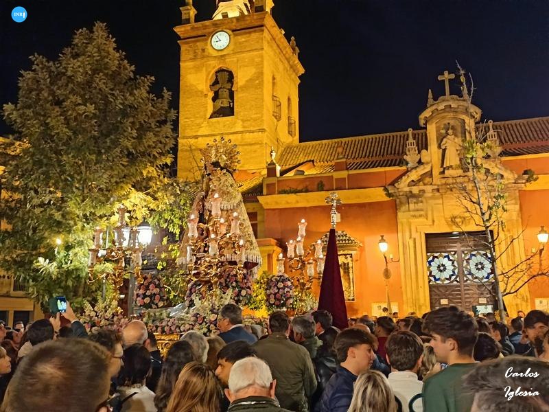 A la tarde, y cuando caen las luces del día, hizo su salida extraordinaria por su feligresía. Lo hizo con en su paso pero sin su palio y con el manto de salida de la dolorosa.
