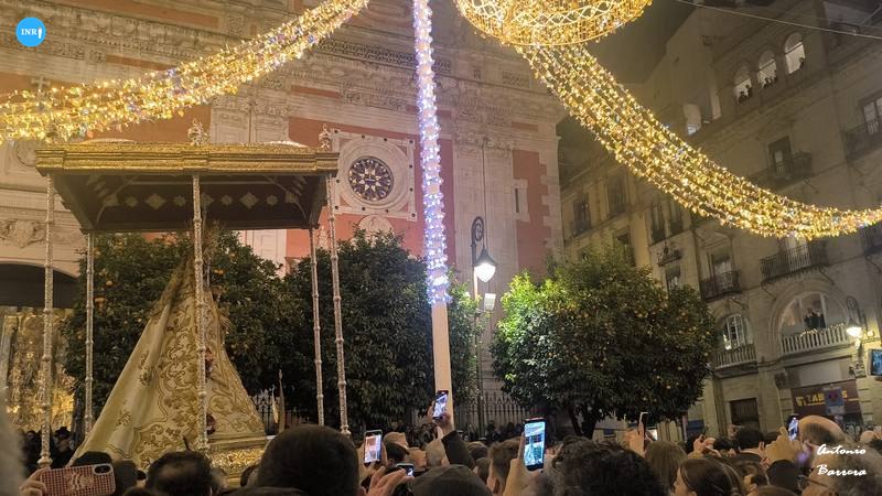 El pasado lunes 22 de diciembre tuvo lugar la salida procesional de la Virgen del Rocío del Salvador, una de la que más público congrega en las corporaciones letíficas. Para la ocasión, volvió a llegar al ayuntamiento hispalense.