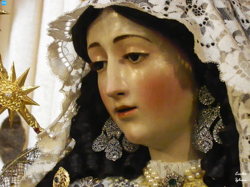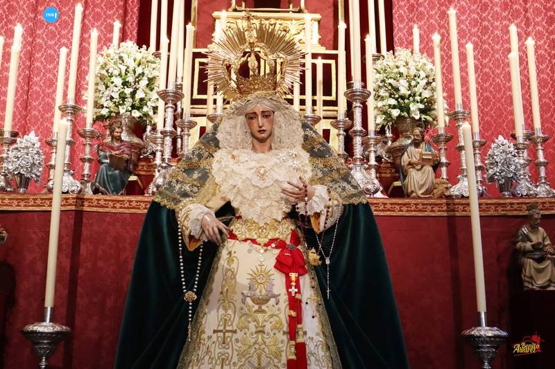 La Virgen del Rosario de la Hermandad de San Pablo realizó un rosario vespertino por las calles de su barrio. Sus hermanos, vecinos, y devotos acompañaron en todo momento a la dolorosa de la corporación del Lunes Santo. Lució manto verde y saya blanca para la ocasión.