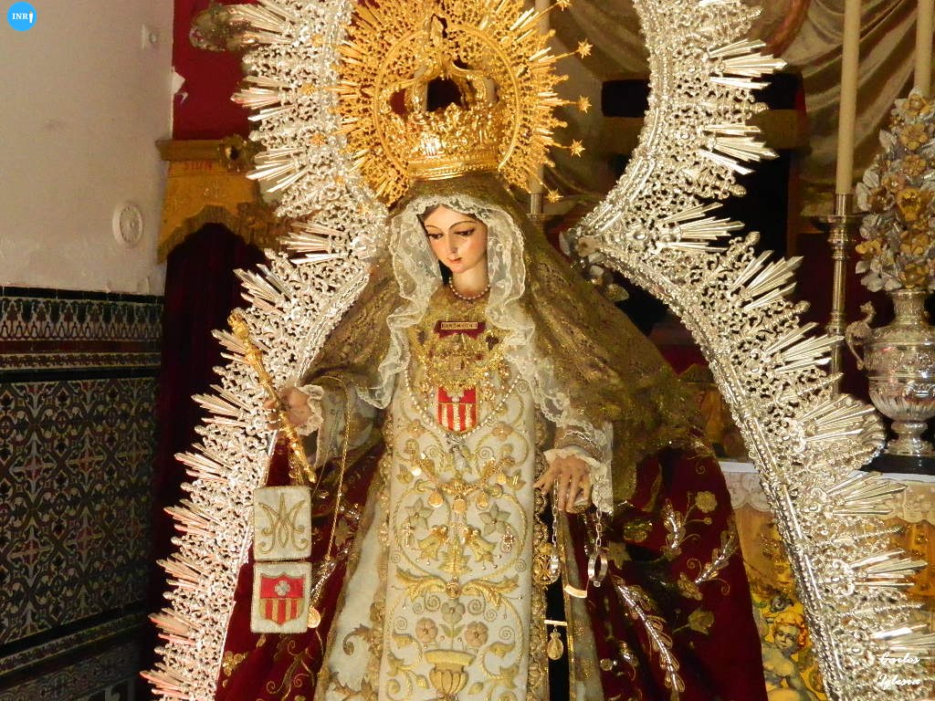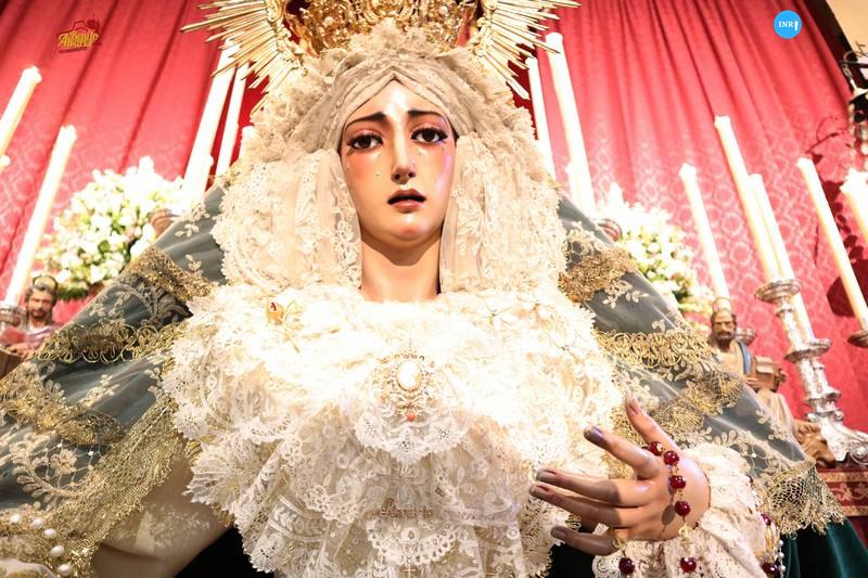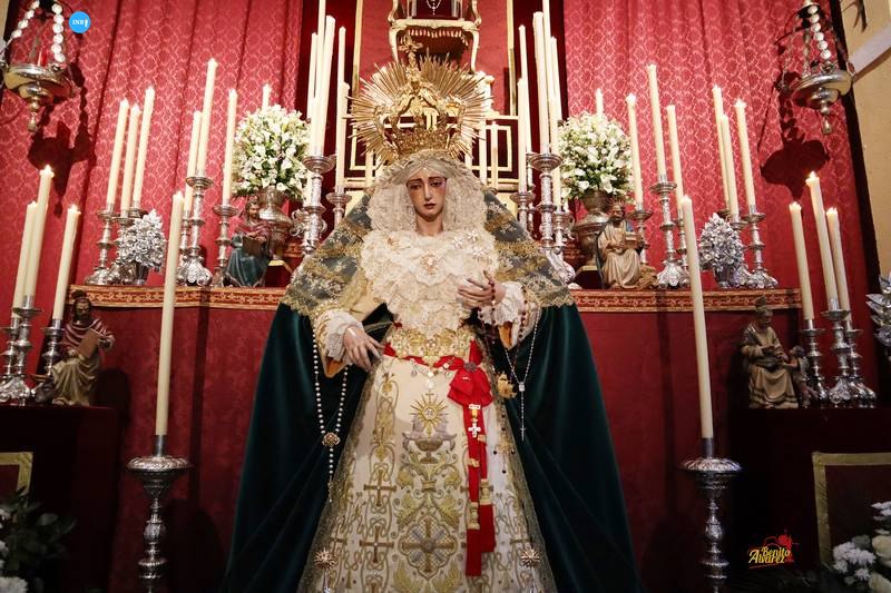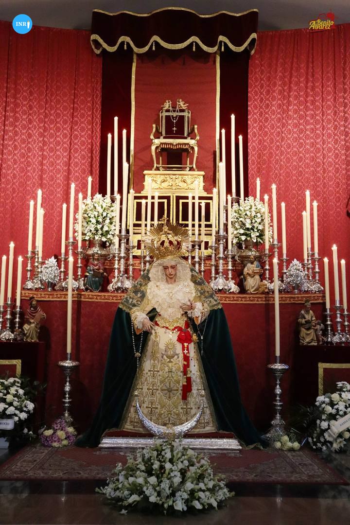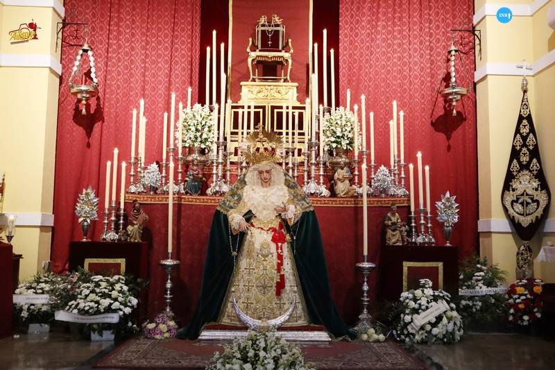 Desde Ciudad Jardín, la Virgen del Rosario de la Milagrosa se encontraba expuesta en su tradicional besamanos. La dolorosa llevaba un manto verde y saya blanca. Tras la imagen un pequeño altar bajo dosel con el sillón de la Realeza de María.