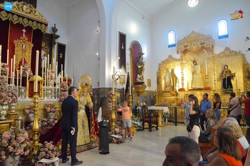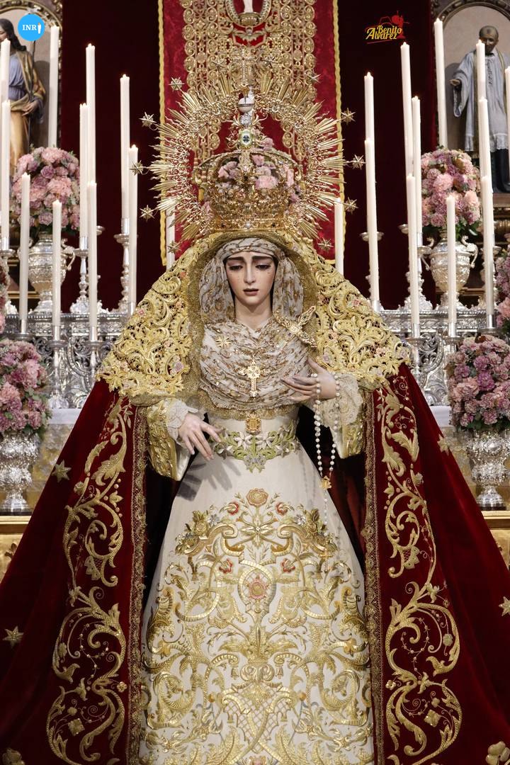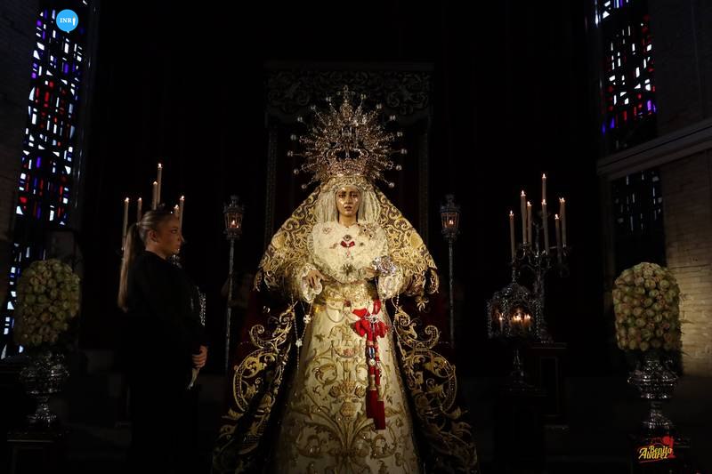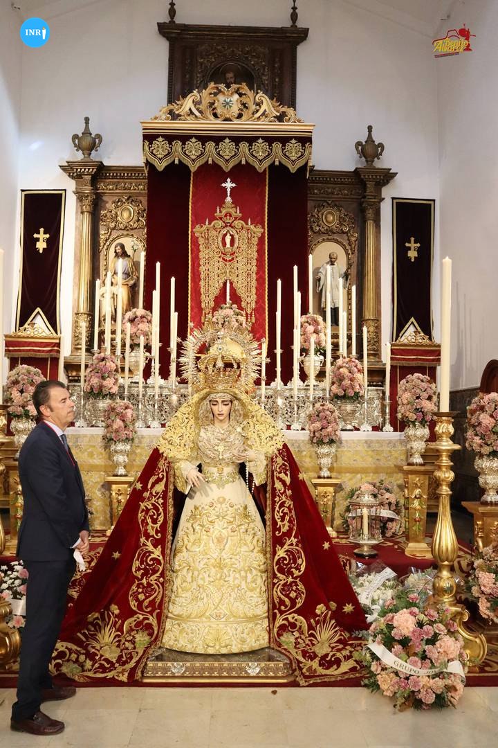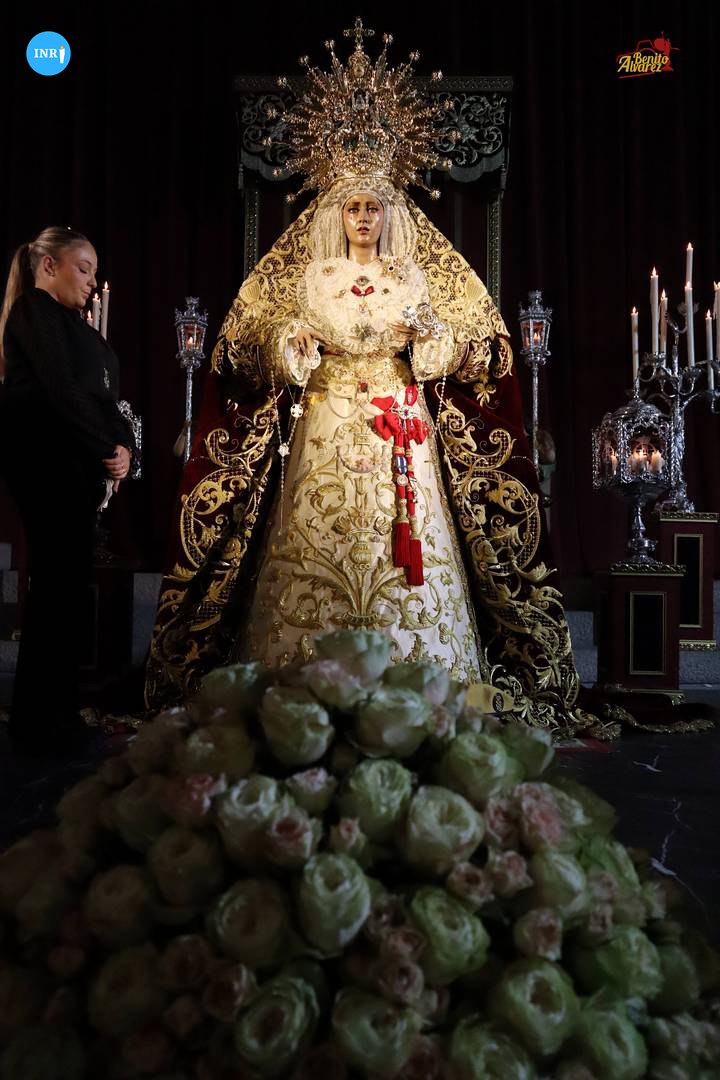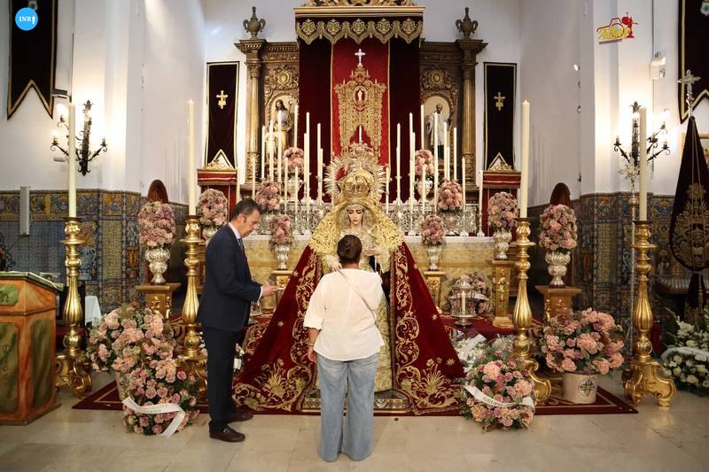 La Virgen del Rosario de la Hermandad de San Pablo estuvo expuesta en besamanos en este tercer fin de semana de octubre. La imagen lució manto burdeos y saya blanca bordada para la ocasión. Estuvo flanqueada por dos ángeles ceriferarios y tras Ella, un dosel.
