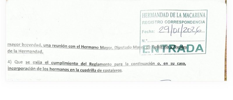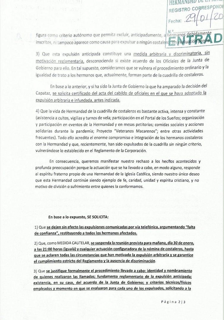 Por todo ello, piden que se deje ‘sin efecto las expulsiones comunicadas por vía telefónica’ y también la suspensión de la igualá y ‘cualquier actuación configuradora de la nómina de costaleros’. Además, quieren que se exija el cumplimento del reglamento interno de la hermandad y se justifique formalmente el procedimiento llevado a cabo y solicitando una reunión con el hermano mayor, el diputado mayor de gobierno y fiscales de la hermandad.