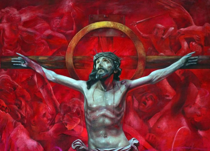 Desde el punto de vista compositivo, el Crucificado se erige como eje vertical absoluto, suspendido sobre un espacio simbólico dominado por un intenso campo rojo que trasciende el dolor para convertirse en expresión de sacrificio, amor, misericordia y vida entregada. En él emergen formas y presencias apenas insinuadas que pueden interpretarse como ángeles, almas o la humanidad misma estremecida ante el misterio de la Redención.