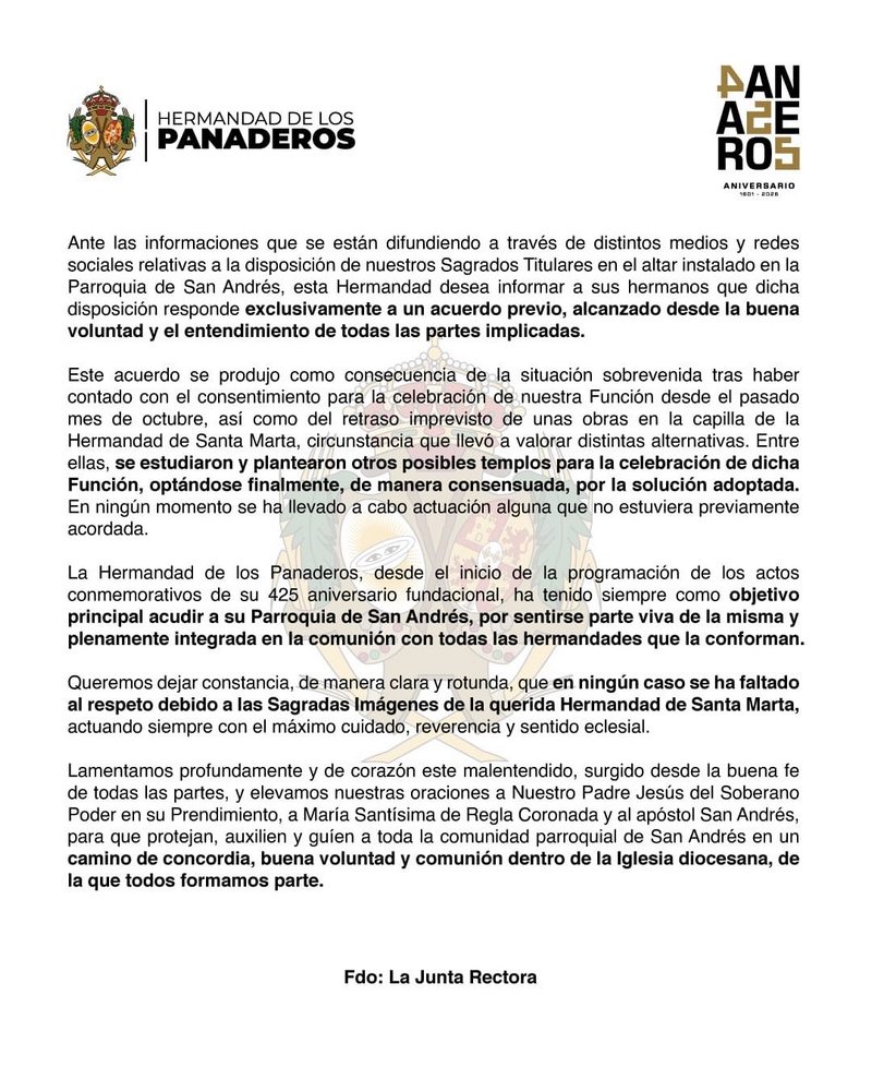 Tras la polémica suscitada con el altar instalado en la parroquia de San Andrés, la Hermandad de los Panaderos ha emitido un comunicado al respecto.