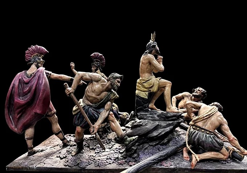 En la delantera se contemplaría dos sayones preparando la cruz para la crucifixión de Jesús, uno de ellos mirando atentamente al Señor de las Penas, mientras que el otro sayón con una especie de palo o lanza en uno de los laterales. En la parte posterior se situarían dos romanos dando órdenes para la realización de la cruz.